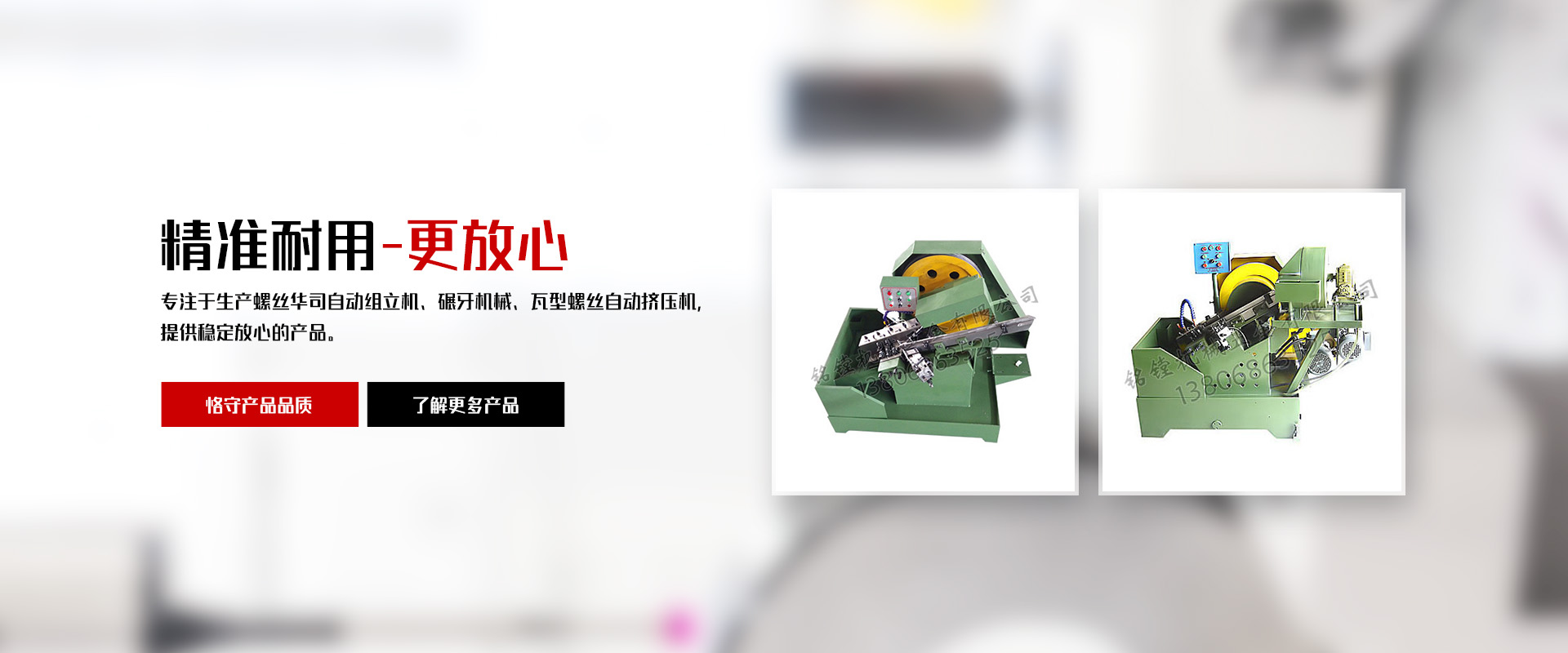 铭镗机械五金有限公司,位于浙南地区经济繁荣发达的乐清白象镇工业园区。公司拥有多年生产螺丝华司自动组立机及碾牙机械,瓦型螺丝自动挤压机,制造和生产经验。公司成立至今以先进的技术完善的科学管理、严格的产品检测及质量保证体系、和完善的售后服务体系;赢得广大用户的好评和信赖。